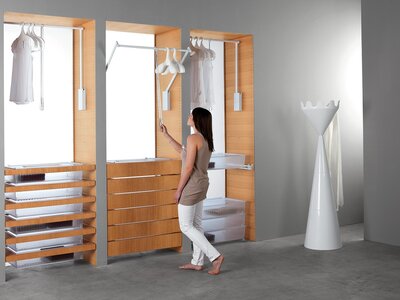 Kleiderlifte von Servetto bringen Ordnung ins Kleiderleben. Das Design ist schlicht und rational und kann in den Ausführungen „Blattvergoldung“ oder „Leder“ und „elektrisch“ bestellt werden. Damit kann der Kunde leicht auch die oberen Schrankbereiche nutzen. Ebenso komfortabel sind Auszugstablare wie Extendo-Libell oder -Fioro von Peka. So kann der gesamte Platz im Schrank optimal genutzt und Zeit gespart werden.