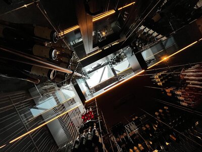 Mit seinen acht Metern Höhe und einem Gewicht von über 15 Tonnen war die Aufgabe für die Planer, aber auch die Ausführenden eine gehörige Herausforderung. Einerseits soll sich der Weinturm als architektonisches Element in das Gesamtbild harmonisch einfügen, andererseits sollen die Gäste auch einen guten Blick darauf haben, um sich an dem technischen Schmuckstück und vor allem seinem Inhalt sattsehen zu können.