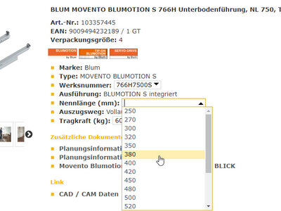 Wir haben wieder etwas Neues für Sie in unserem Webkatalog, das für Sie die Suche nach dem richtigen Artikel noch leichter macht: Wählen Sie ab sofort bei unseren Produkten direkt die passende Ausführung – ob Breite, Länge, Farbe oder Tragkraft – mittels Dropdown-Menü aus. Die Ansicht mit der Merkmalsauswahl wird ausschließlich auf der Detailseite angezeigt.