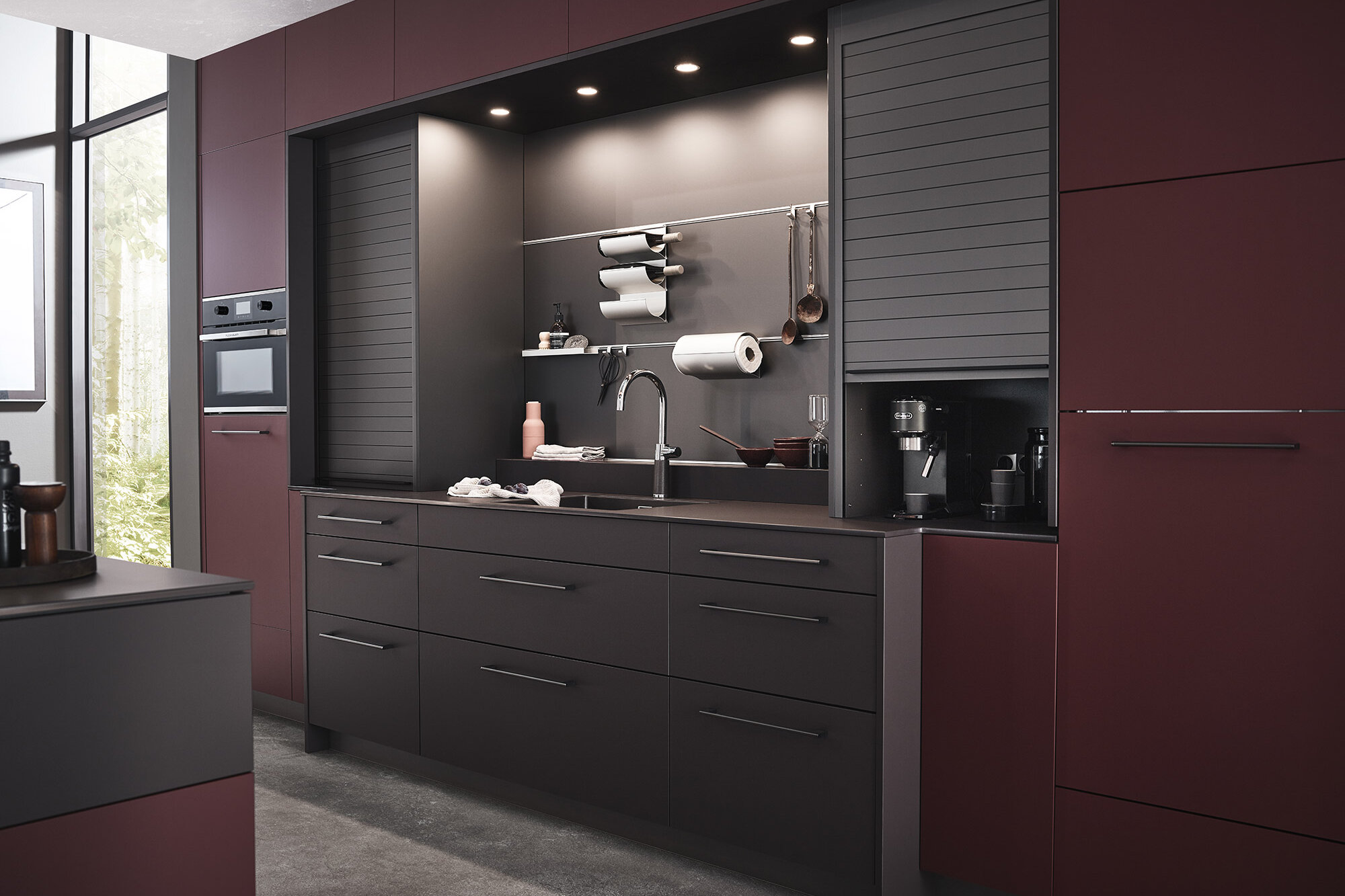 Oberflächenwerkstoffe, Nischenrückwände, Wandpaneele, Kantenbänder, Schrankrollladen und die Stauraumlösung Flipdoor im perfekten Designverbund, das ist das Geheimnis der Rehau Interior-Kollektion run